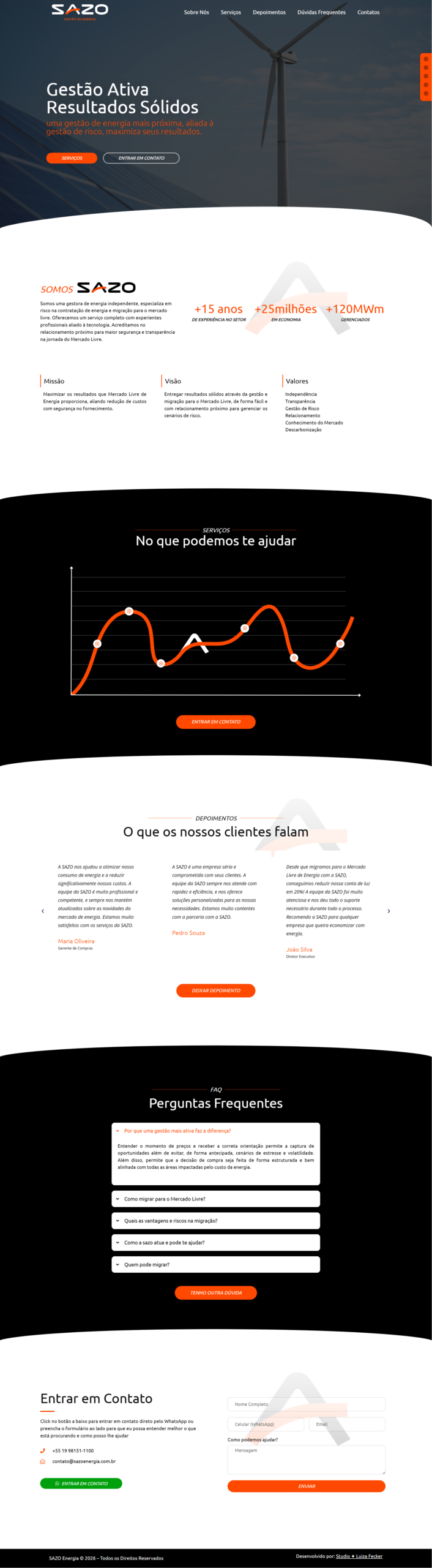 O desenvolvimento do site institucional da Sazo foi pensado para traduzir, com clareza e autoridade, a complexidade do mercado de energia em uma experiência simples, estratégica e confiável. Como gestora de energia, a Sazo precisava de uma presença digital que transmitisse segurança, proximidade e domínio técnico — sem perder acessibilidade na comunicação.